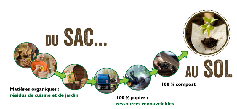 Les sacs de plastique, même ceux de type bio-dégradables ou qui sont certifiés compostables ne se décomposent jamais entièrement dans le site de compostage. Ils peuvent laisser des particules dans le sol. Les sacs en papier, eux, contribuent au cycle de décomposition de résidus organiques en ajoutant des substances nutritives indispensables au processus de compostage. Nos sacs à résidus alimentaires ne contiennent aucun plastique et sont fabriqués entièrement à partir de ressources renouvelables. Tous les matériaux, y compris la colle et l’encre d’origine végétale, sont compostables à 100%.